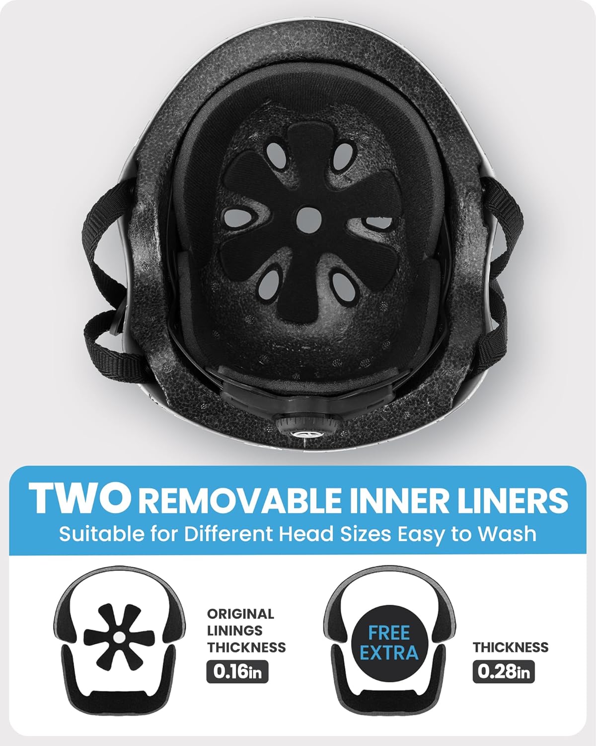 - Extra Removable Lining: Skateboard helmet with two removable liner for different head sizes and easy to wash the sweat away