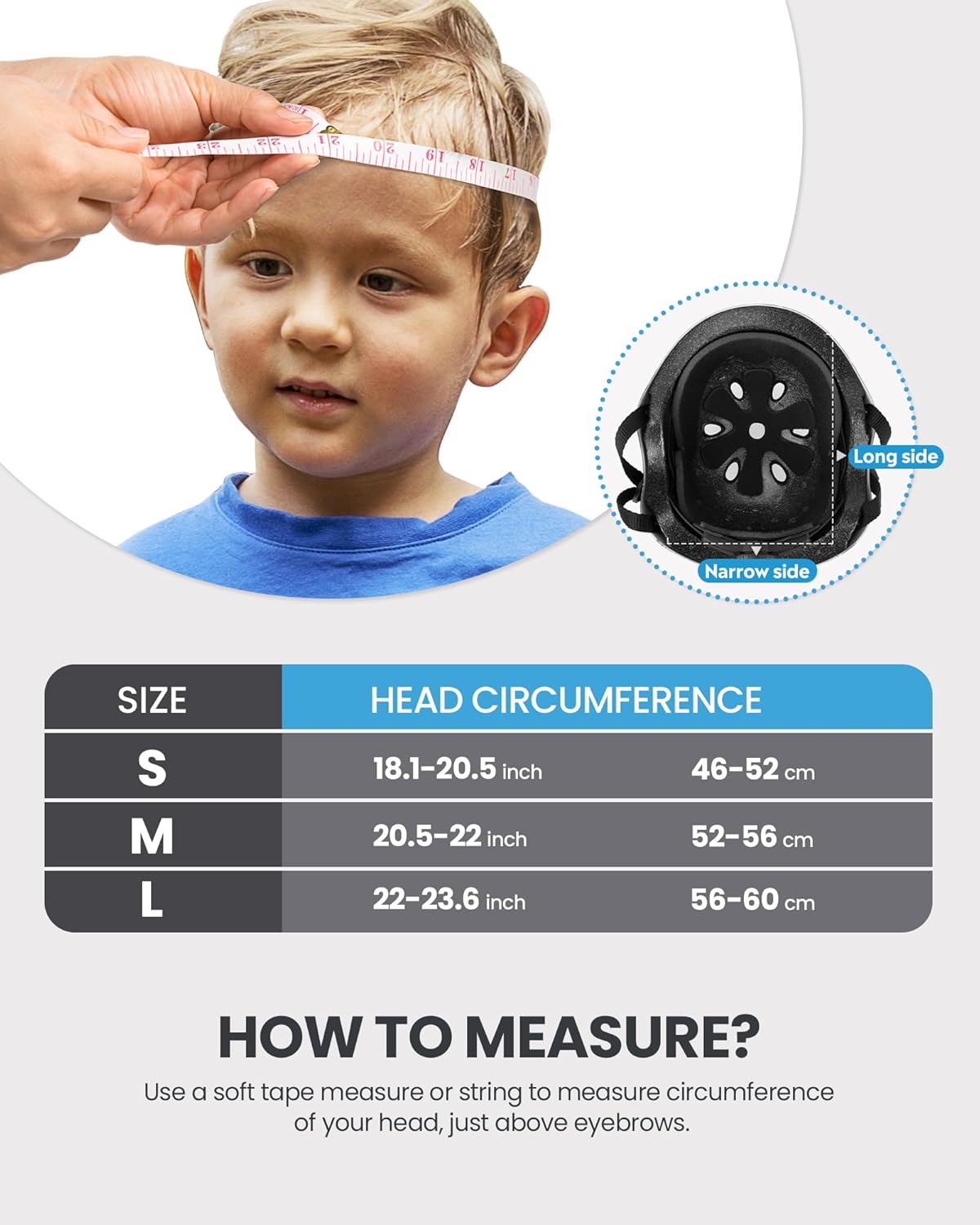 - How To Measure A Proper Helmet: To find the right size bike helmet, start by measuring your head circumference, wrap a flexible tape measure around the largest portion of your head about one inch above your eyebrows. Or, wrap a string around your head, then measure the length of string with a yardstick. Size Large is recommended if your size is between 21.3-22.8 inch (54 cm-58 cm). Recommended Age Grade for this helmet: 5 years and older