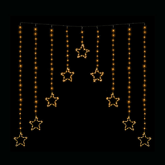 Embrace the celestial allure of our LED Gold Wire Star Curtain and let its radiant glow illuminate your festivities with elegance and enchantment. Witness the magic unfold as the delicate Gold Stars cast their warm and inviting glow, creating cherished memories that will last long after the Holiday Season.