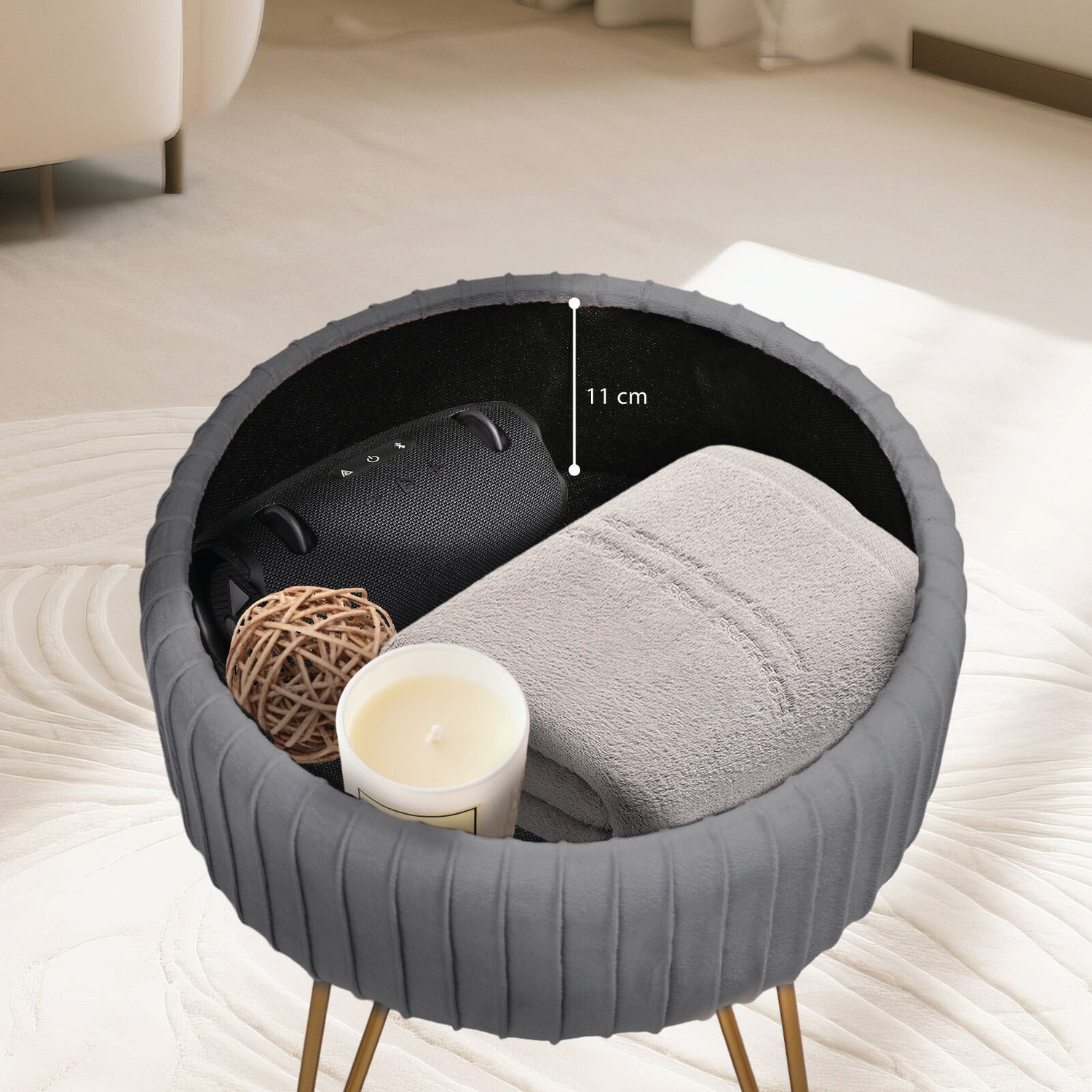 This velvet ottoman is a stylish solution for keeping things neat while adding a touch of elegance to your space. It also serves as a handy side table for everyday essentials.