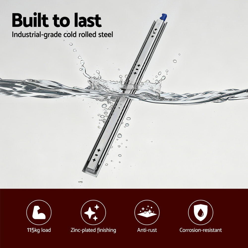 Enhance your storage setup with the Giantz Heavy-Duty Drawer Slides, engineered for superior performance and durability. Available in a range of lengths from 700mm to 1400mm, these slides can handle a substantial load of up to 115kg, making them perfect for your toughest projects. Whether it's a UTE toolbox, a camper trailer's storage, or a 4WD cargo system, or household cabinets, these slides provide reliable support. Experience effortless operation with the precision ball bearings, ensuring a smooth and silent glide every time. The integrated nylon buffer design offers a soft and quiet close, while the optimized PP triggers make locking and unlocking simple and safe. Built from thickened zinc-coated cold-rolled steel, these slides are designed for a long lifespan, capable of withstanding over 50,000 opening and closing cycles. The lock-in/lock-out design ensures your drawers stay securely in place on uneven ground. With full extension, you can easily access items at the very back of your drawer, maximising your storage and convenience. Upgrade your drawers with Giantz and enjoy a combination of strength, safety, and smooth functionality.