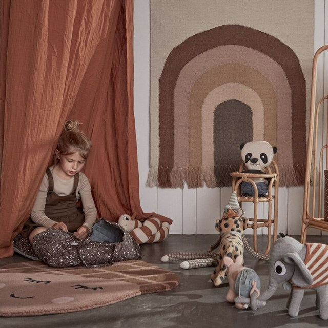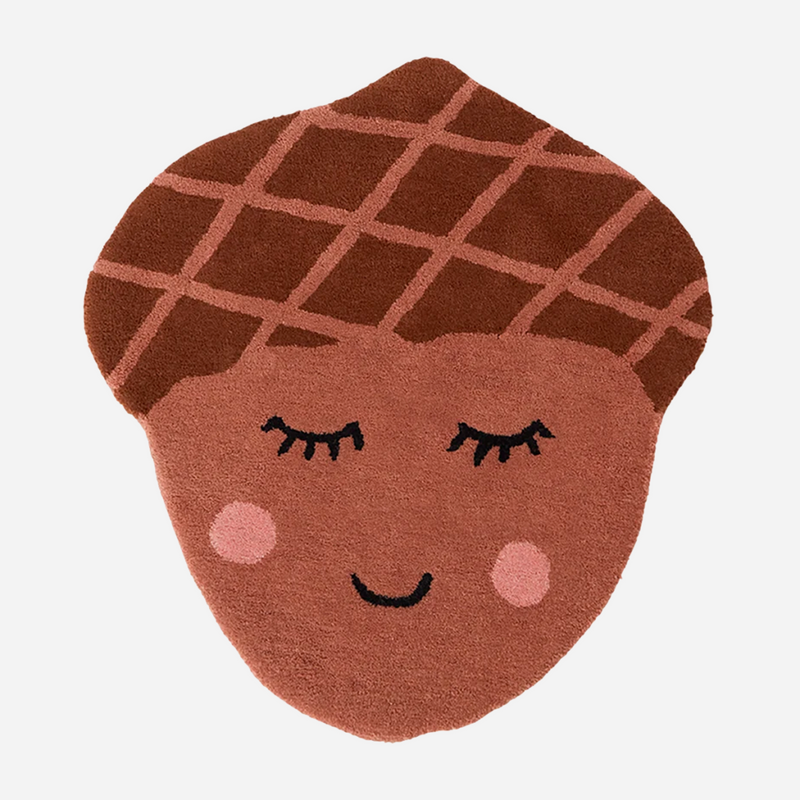 Bring warmth and charm to your space with the Wool Tufted Acorn Rug. Featuring a rich chestnut brown shade in two tones, this beautifully crafted rug showcases a serene, smiling face detailed in black with rosy pink cheeks. Designed to complement modern interiors, it adds character and style to your playroom or child's bedroom while offering soft protection for little hands and knees.